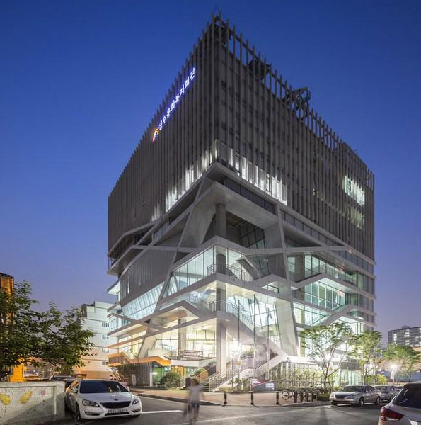 韩国Seongdong文化及福利中心(Seongdong Cultural &Welfare Center)的建筑设计不仅仅是一个简单的政府办公楼设计概念,它直接反应了政府关于文化与福利的执政理念。一般的福利中心位于最贫穷的工业地区,该中心类似这些福利中心的总部办公。一般的政府办公部门都是作为管理机构,而这里将是一个将政府的执政理念像种子一样散播出去的播种机,其目的在于改变当地的城市生活。