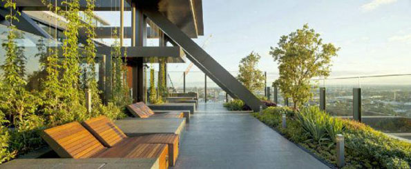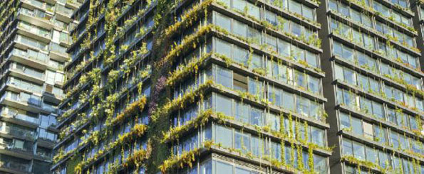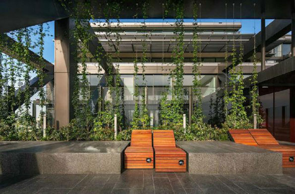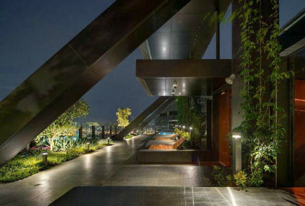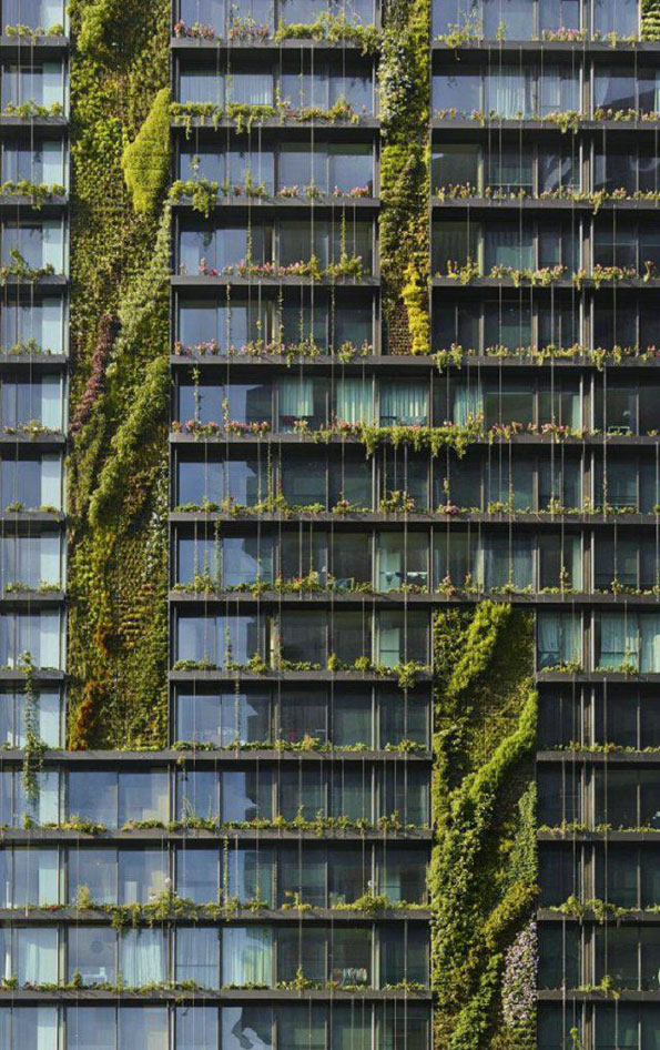 就像中央公园的纽约,64000平方米的公园是一个郁郁葱葱的宁静的会议的地方可以与朋友和家人放松解开。中央公园拥有一个巨大的悬臂,从大楼的正面延伸80 米,还有一个空中花园,带有瀑布泳池和餐饮露台,专供蓝天阁的住户使用。固定在悬臂上闪闪发光的反光装置是由Yann Kersale 设计的耀眼发光艺术品,包含近3000 个彩色灯泡。该大楼掩映于充满生机的绿色花园之中,花架的线性长度总计达7 公里,超过1000 平米的垂直花园高达130 米——这座世界上最高的“绿墙”由Patrick Blanc 设计。而内部设计则由Koichi Takada 打造,极尽奢华,色调以天然木材与石料为基础,营造有机和谐之风。