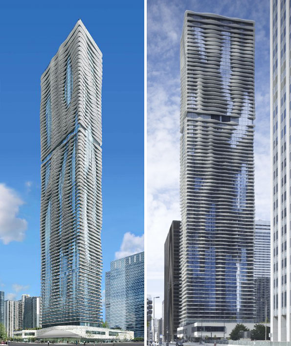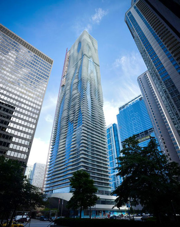 像芝加哥这样城市密度越来越大的城市,新建塔楼内望向已有建筑间的视线必须要仔细斟酌。爱克瓦大厦(Aqua Tower,Aqua有"水"的意思,译者注)借助一些准则,如视线、遮阳和功能,来控制建筑外轮廓的竖向体系。整个建筑看起来像一个巨型雕塑。大厦各层伸出的、渐变的室外平台确定了建筑的竖向形体。室外平台的使用提供了大厦与室外的紧密连接,同时大厦的立面和其外的城市空间被居住者直接使用。这样处理产生了远近不同的效果:近处仰视有种强烈的雕塑感,而远处观看仍然是一个细长的矩形体量。大厦强有力的形体犹如裸露的石灰岩层,并体现了那种塑造大湖区域的地质力量。