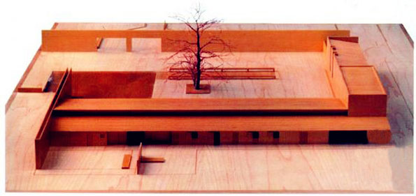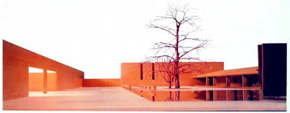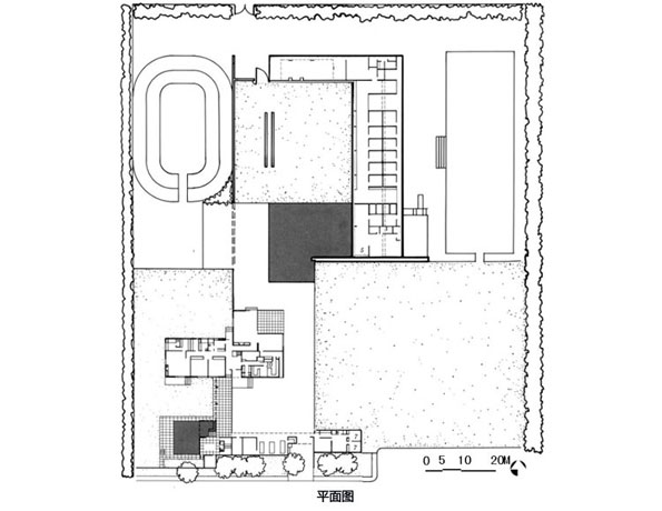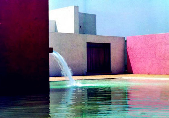 在入口处,墙体营造了一个独特的空间氛围,人们仿佛渐渐地被引向了远处的水面。水从一堵铁锈色的墙上溅落下来,注入池中,马厩的门也被巧妙地隐藏在了墙体后面。这堵墙后面,一堵更高的粉红色的墙,提高了整体空间尺度并体现了空间的真正功能——围合了后面的马厩。这面高墙和另外一面紫红色的矮墙组合在一起,环拥了整个庭院,马儿在这样一个优美的舞台上悠闲地散步……