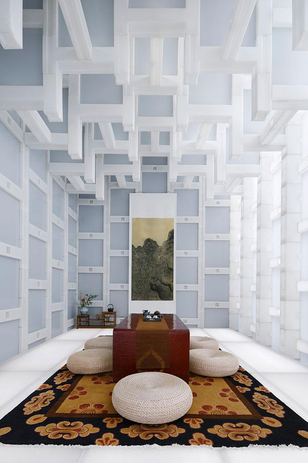 老北京,可是砖儿砌起来的,这个250平方米的四合院也不例外,整个设计中也使用到了砖,不过却是现代版的砖石---隈研吾采用了四种尺寸的浅色聚乙烯空心砖,其具有良好的热工性能,却又能像纸一样通过光线。