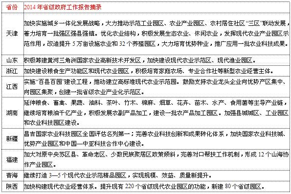 表2-1 2014年各省、自治区、直辖市政府关于农业产业园区工作计划汇总