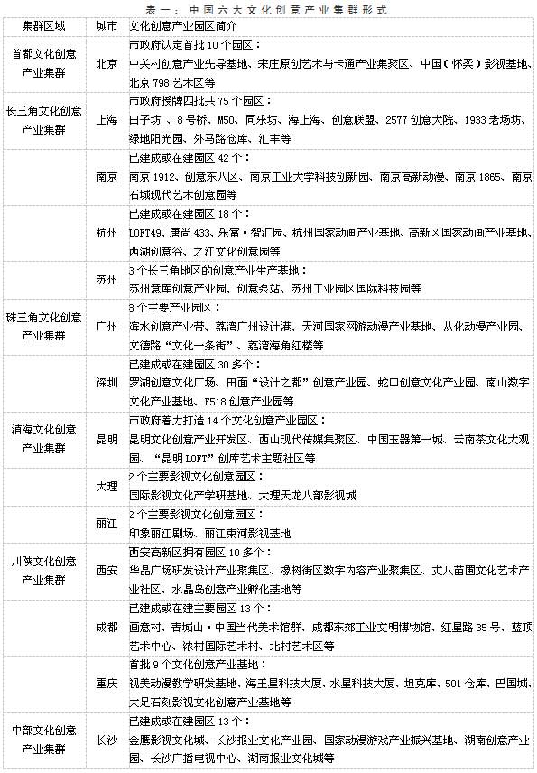 我国目前已形成的六大文化创意产业集群都建立了数目众多的文化创意产业园区,这些园区通过将众多相关的企业聚集在一起,共享生产要素,降低企业生产成本,便于企业之间开展合作,产生互补效应,也有利于形成激励企业持续发展的环境,促进园区内企业整体创新能力的提升。因此,加强文化创意产业园区建设对发展我国的文化创意产业建设具有重大意义。下表为中国六大文化创意产业集群各城市建立的文化创意产业园区总数及及相关简介:
