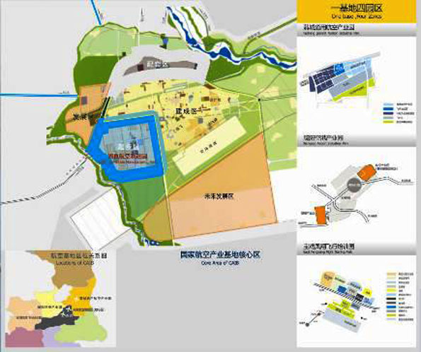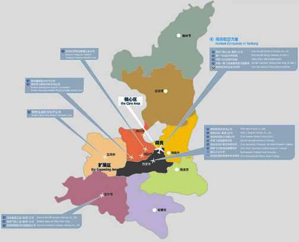2004年8月正式批复成立的西安阎良国家航空高技术产业基地是以西安阎良为核心,拓展到关中地区,搭建“一基地四园区”的空间发展格局。一基地指国家航空产业基地。四个园区分别是:阎良航空核心制造园,规划40平方公里,重点发展整机制造、大部件制造和零部件加工;蒲城通用航空产业园,依托蒲城通用机场和低空空域资源,规划20平方公里,重点发展通用飞机的整机制造、零部件加工、飞行员培训、航空俱乐部等通用航空产业项目;咸阳空港产业园,依托西安咸阳国际机场,规划12平方公里,重点发展民用飞机维修、定检、大修、客改货、公务机托管、零部件支援、航空物流等项目;宝鸡凤翔飞行培训园,主要从事飞行员训练及航空相关的业务培训活动。