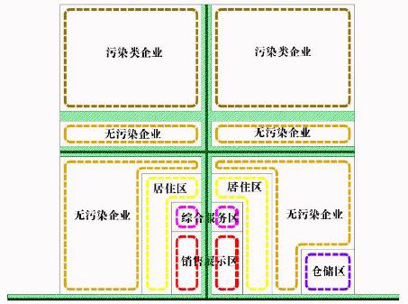 根据以上分析,规划总结出工业园区普遍采用的布局模式主要包括(图3):通常采用轴线式布局,居住区及相应的公共服务设施(如展示区、行政办公区等)通常设置在园区主入口,并结合开敞空间营造丰富的主入口景观。考虑到对居住区及公共服务设施影响的最小化,将污染企业设置在园区另一端,并综合配套污水处理及其它环保设置。其它无污染企业可间插布局,作为二者的过渡地带。仓储区结合园区主要的对外交通干道布置。