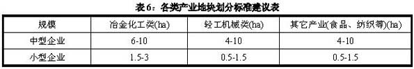 工业用地地块划分应结合工业门类以及企业大小规模的特点综合考虑,根据首期引进企业规模的分析,各类型、各规模的企业地块大小的标准建议如下: