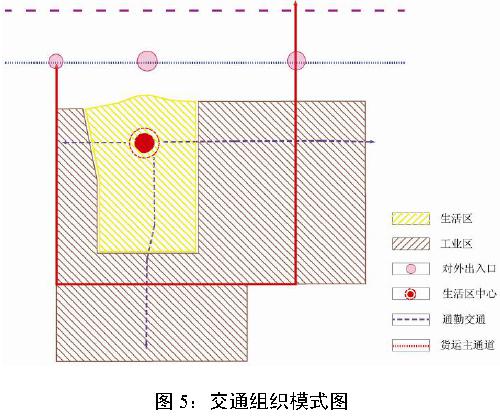 东方工业园区的交通组织模式引入“交通安宁区”的概念,围合生活区域的道路应予以明确,将货运通道设置在生活区域之外,以不会干扰生活区居民的日常生活,形成交通安宁区。
