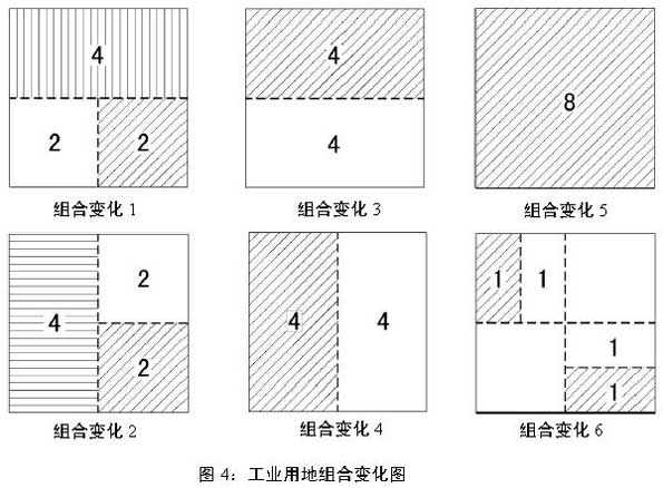 将工业用地以基本单元进行划分,根据基本单元的面积大小,确定道路间距,同时基本单元可自由组合成大地块并可细分为小地块,满足不同产业对用地规模的不同要求。保证基本单元有两个面向,2 公顷以下地块保证有一个面向,中央用地以方形地块为主,边缘用地以矩形地块为主,加大沿道路面的长度,便于设辅助出入口(图4)。