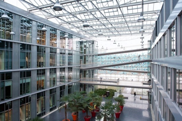 建筑内部创造了很多交流和碰面的空间:开放的中庭可以成为灵活的工作空间;把电梯建到角落里,鼓励人们走楼梯,在上下楼梯的过程中,能和同事不期而遇,也看到其他同事在做什么。