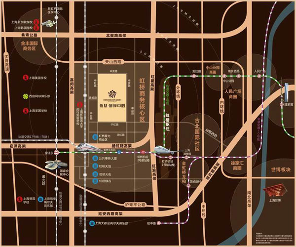 恒基旭辉中心毗邻世界最大的中国博览会综合体-国家会展中心,新虹桥医学中心等国家级重 点资源,集结国内外企业总部、功能性贸易机构和投资机构50家左右,其他各类配套企业500-700家,打造上海国际贸易新中心,成为服务长三角城市轴、 辐射全国乃至世界的高端商务综合体。