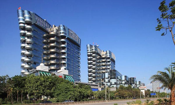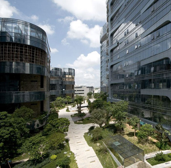 该项目是位于侨香路的西端,华侨城的北端,紧靠整个华侨城郁郁葱葱的绿色环境。项目周边均是二至三层高等待被开发的工厂旧址。项目的用地面积为27000平方米,容积率为3.7,由四栋分别为一对33米层高的低层办公楼和一对100米层高的办公楼组合而成。因深圳以亚热带气候为主,风向主要来自东南方向。因此,四栋建筑采用错位式排列,以利于日照、采光和通风。办公楼外立面的幕墙采用了不同的色调(蓝色、绿色和金色),视觉上把建筑体量缩小,形成极具超现代化的视觉感受。地下室设置了多项采光井,以增加自然通风,并允许自然光线到达地下每个领域。建筑一层设计了架空层,形成一个开放宽敞的公共空间,并连接电梯到大堂的园林空间,扩大了景观的绿化面积。