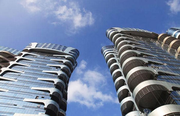 智慧广场是一个低密度、豪宅式、低碳商务办公空间。由于地块不是正南北朝向,四栋建筑采用错位式排列,将内景观环绕在建筑四周,轮廓线为北高南低,加上错位布局,使内外景观最大化。该项目坚持绿色生态化办公的概念,设计构思充分考虑了用户使用的灵活性。许多独特的办公空间设计以前没有看到的建筑特色,在智慧广场都得到了充分的体现。