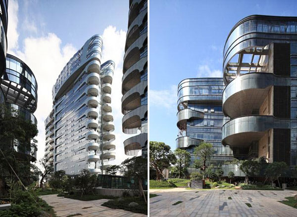 智慧广场建筑立面的设计灵感来自大自然,以抽象化的竹子、大海、波浪为设计的主题符号,通过建筑强烈的韵律感与自然集合元素及立面材料的对比,塑造出一个富有现代象征性、标志性的生态建筑。外圆内方、无棱角的弧面外观设计,不但使建筑拥有鲜明的超现代个性,而且极大地提高了采光通风效果。全玻璃幕墙的外墙构造,又使整个建筑充满了科幻感。