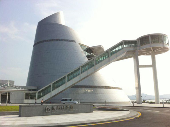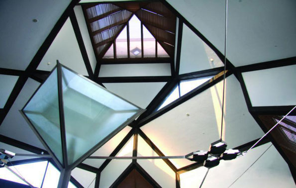 主體由一個傾斜的圓錐體、一個半球體和一個菱形的基座組成,這三部分的功能分別是展覽廳、天文館和會議中心。遠遠望去,建築物的外形科學味甚濃,采用了貝氏一貫的幾何圖案的建築風格。