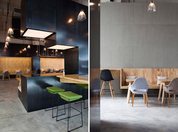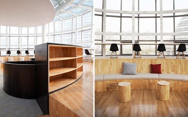 “灵活性”是二层另一设计核心。二层的设计不是为某一类型的活动特定设计的,相反,正如CupOne最初的设想,它是一处可以提供不同类型活动的场地。举 例来说,与传统“一桌两座”的传统模式不同,墩状圆柱咖啡桌沿圆形长椅摆放,作为可移动元素,使用者可以根据不同需要将它们进行不同摆放。如果场地需要, 我们也可将圆柱搬走存放在其他位置,这样处理过的场地便可用来举办讲座或展览等活动。