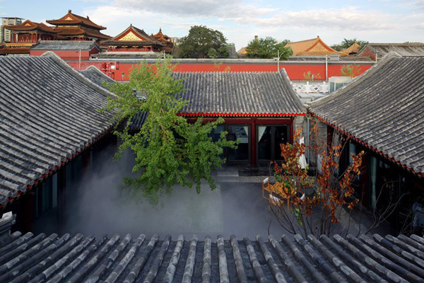 设计师对传统园林是抱批判态度的,认为其设计偏于繁琐。京兆尹餐厅的景观设计中把传统庭院内的元素简化成几个色块和质感,如暗红色的木框架、灰色的砖铺地,灰白相间的石子。把古代景观中的琐碎去除,同时把其精华质感调动出来。