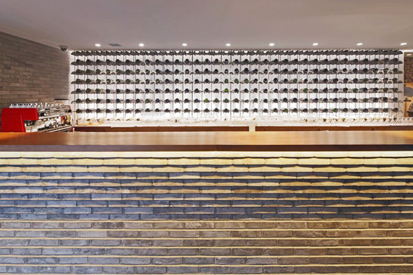 京兆尹餐厅的装饰采用了传统材料当代做法的策略。从四合院中提炼取了木、砖、瓦等典型材料,用非常规的使用和建造方法来组织它们:将木作成砖来砌筑;砖叠涩本是墙的砌法,但被移植过来作吧台;屋顶上用的瓦则用来搭屏风等。其目的是想达到传统和现代的共生与结合。