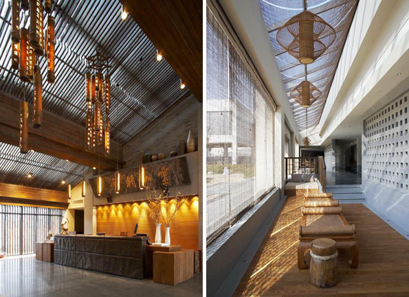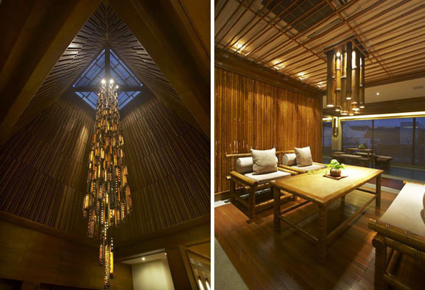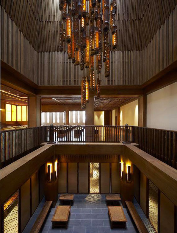 一入大堂,木质的带有风化感的条形格栅天顶、旧铜打造的前台,还有竹子做的几盏大吊灯让人的心一下子就沉静下来。朴素的客房,简单但也很精巧,透过细密的竹帘,目光可以穿越到窗后禅意的小院子里。禅堂素雅,竹子的顶棚,竹子的天灯都照应着向禅的心灵回归自然无我。茶室里的家具简约但也渗透出禅境,让客人更好地在参茶的过程中调节心境。这所精致Resort正以“禅”为主题,提供客人“禅”的教诲,“禅”的感悟,“禅”的意和境。