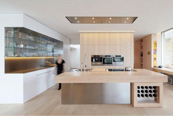 如果是纯白色的厨房可能就略显枯燥了,所以U6设计事务所选择了浅色木材来做橱柜,为这个开放式的厨房增添一丝温暖。