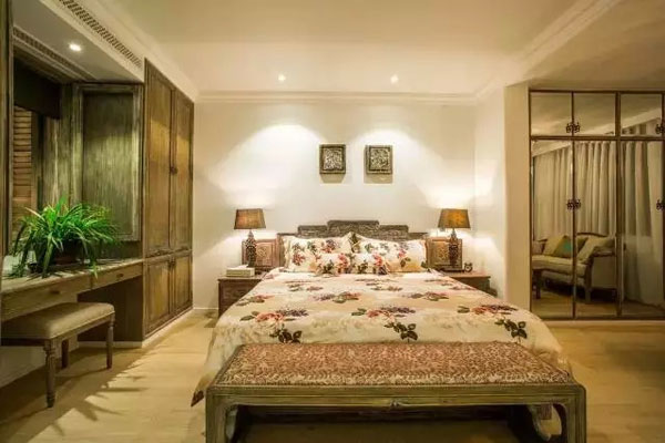 主卧是风格鲜明的家具,更似一件工艺品般展现出优雅不俗的装饰效果。以美式仿古的姿态,安于一隅的衣柜,在日月更迭,光与影的交替中,唤醒居者美好的记忆,释放向往自然,回归自然的情怀。天然白色洗石子的浴室,传统手工艺的质感,古朴的颜色,光影变幻,更具灵气与自然之力,与复古的居室相得益彰,娴静温柔地带来一种安全感。