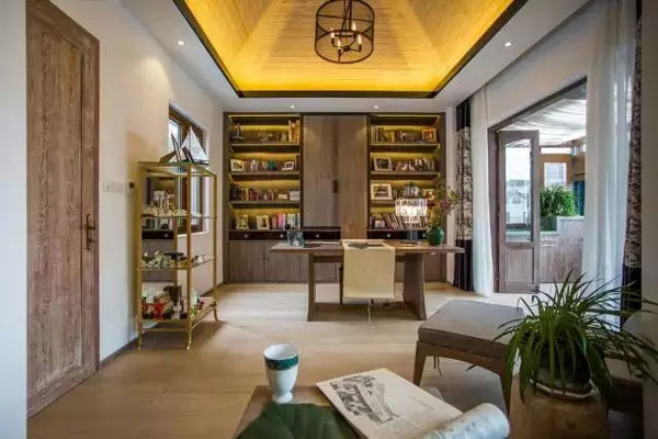 大音自成曲,但奏无弦琴。一席阳光透过竹帘,婆娑地洒在室内,无需过多的饰品,矫揉造作的修饰,晨午黄昏,斑驳光影中,书房每时每刻都呈现不同的格调,为闲情雅致赋予不同的曲乐。云归处,人归来,华灯初上,几榻有度,器具有式,位置有定,通透有序,含蓄不事张扬。无需焚香,新中式风格的古朴家具中,就透出幽幽的墨香。