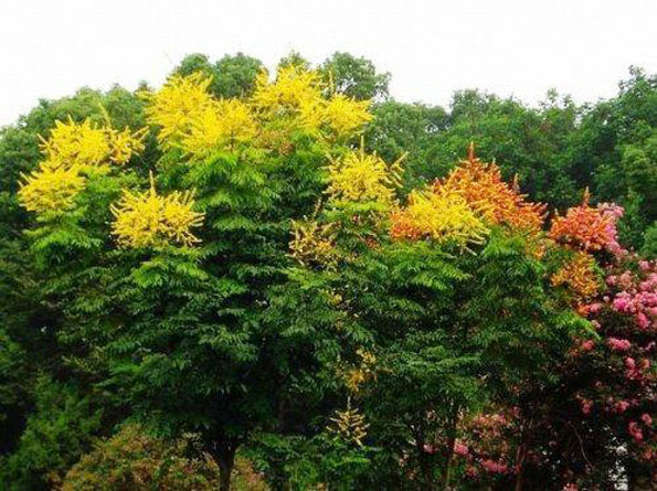 栾 树:栾树为落叶乔木,春季嫩叶多为红叶,夏季黄花满树,入秋叶色变黄,果实紫红,形似灯笼,十分美丽;栾树适应性强、季相明显,是理想的绿化,观叶树种。 栾树春季观叶、夏季观花,秋冬观果,已大量将它作为庭荫树、行道树及园景树,同时也作为居民区、工厂区及村旁绿化树种。