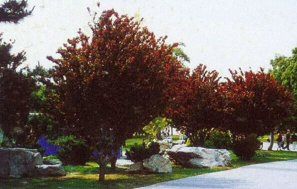 紫叶李:紫叶李叶常年紫红色,著名观叶树种,孤植群植皆宜,能衬托背景。尤其是紫色发亮的叶子,在绿叶丛中,像一株永不败的花朵,在青山绿水中形成一道靓丽的风景线。