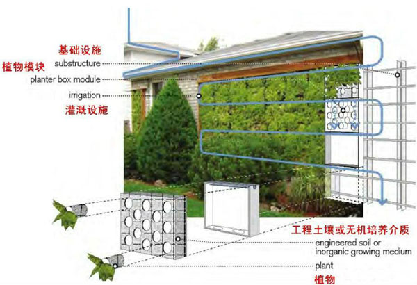 墙面绿化 | 水流控制/过滤 | 在网络起始处,直接连接屋顶 | 从小尺度的住宅应用到较大尺度的商业应用 | 根据不同的物种偶尔需要浇水和修剪 |