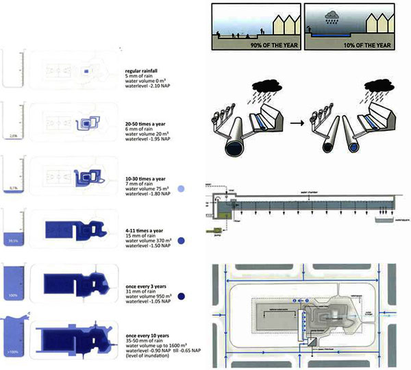 为了解决这一问题,城市规划师与工程师制定了一套水规划,将城市内有效蓄水与提高公共空间质量结合起来。这一所谓的“水规划2号”于2007年10月正式生效。这套空间战略直接将空间的数量与所需水资源的水量联系起来:在城市郊区,所有新的开发都必须建造大型的雨水缓冲区。在人口密集的老城区和市中心里,也必须找到更紧凑的解决方案。这些方法既有大尺度的技术办法,也有小尺度的更具美学价值的方案介入。其中,在鹿特丹博物馆公园里正在建造一个能迅速调节排水溢流的下沉集水盆地。与此同时,城市议会激活了一个补贴计划:鼓励个人在自己的物业里建造屋顶绿化,以此能让雨水落入地面之前得到缓冲。其实,缓冲的效果是有限的,但内含的教育意义却是积极的。最后,一个在街面缓冲雨水的解决方案应运而生:水之广场。