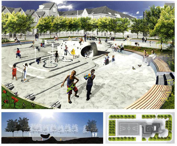 这一方案,由De Urbanisten 和Studio Marco Vermeulen提出,将提升公共空间质量与一套工程技术系统结合起来。作为空间设计师,能将资金用在洪泛设施上又同时设计出人们喜爱的空间,这便是水之广场这一想法的来源。大多数这样的空间可以有效地被用作开放空间。只有在大型暴雨时,空间被用来暂时储存雨水。因此,花在技术基础设施上的钱可以转化成花在建造更好城市空间的钱。水之广场可以被理解为两方面的战略:一方面,它让投资在蓄洪设施上的资金使用既透明清晰又赏心悦目;另一方面,它带来了营造环境质量与城市空间个性的机遇。