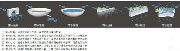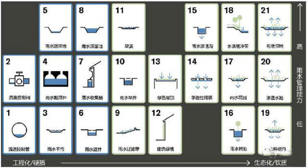 依据雨水控制、雨水阻滞、雨水滞留、雨水过滤、雨水渗透与雨水处理等 六种雨水管理的过程,可以设计构建从工程化硬质到生态化软质的一系列雨水管理景观设施,包括:雨水流量控制阀、流速控制管、雨水干沟、雨水阻滞井、雨水阻 滞池、雨水湿井、建筑落水收集桶、雨水滞留池、雨水过滤带、雨水旱井、雨水旱溪、建筑绿墙、绿色屋顶、渗透性铺装、雨水渗透沟、雨水树池、雨水花园、水滨 缓冲带、雨水种植沟、渗透水池、构造湿地等二十一种雨水管理景观设施