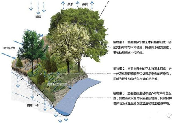 如水滨缓冲带( R i p a r i a n B u f f e r ,RB),它主要是利用滨水的乔木、灌木、草本构建的不同植物群落带以及水岸的土壤、砂石等渗透性材料进行雨水管理的生态景观带。其中水滨缓冲带的宽度要 根据水岸景观用地范围、土壤类型、堤岸宽度与坡度等进行综合考虑与设计。水滨缓冲带可以单独应用于城市地块各种水体堤岸的边缘,也可以和其他雨水管理景观 设施整合应用于城市开发项目中,在雨水径流最终注入水体前完成对雨水径流减速、雨水渗透减量、雨水过滤净化的作用。