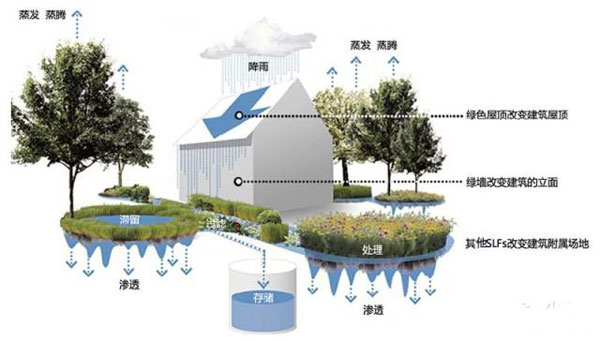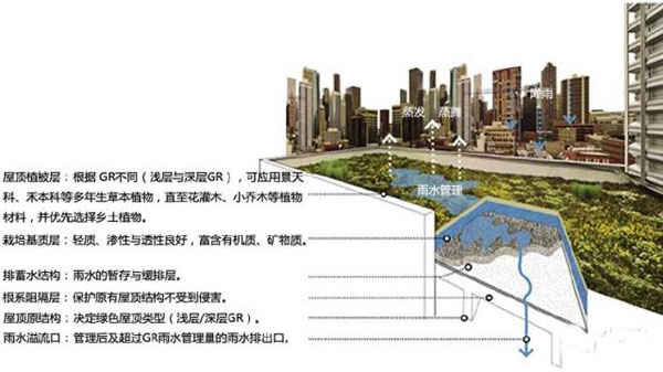如绿色屋顶(Green Roofs,GR),它是指建筑屋顶的部分或全部由绿色植物、植物生长基质及屋顶防水结构覆盖的一种景观屋顶形式,通常还包括植物根系阻隔层、屋顶排蓄水 层和灌溉系统等结构。绿色屋顶可以方便地应用于从居住建筑、办公建筑到大型工厂建筑等不同类型建筑上,在城市雨水径流生成、雨水污染生成重要源头的建筑屋 顶上完成减少屋顶雨水径流总量、洪峰流量,增加屋顶雨水径流延迟时间,降低屋顶雨水径流流速,及净化屋顶雨水水质的功能。同时,绿色屋顶还有减少建筑制 冷、制热能源消耗,减轻城市热岛效应,提供动物栖息地以及为人们提供宝贵室外活动空间等功能。
