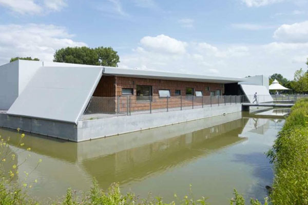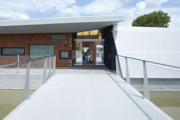 精神残疾人日托中心位于一座小岛上,小岛成为新城市的扩展空间。从城市的角度来看,应该采用多层建筑体量,但是由于使用功能的需求,客户要求一层。为了解决这个矛盾,建筑的体量看上去符合城市的要求。小岛和建筑一起被开发,建筑的屋顶和外墙完全一体化。