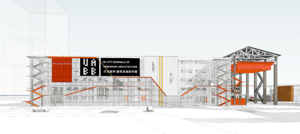 8#楼原有功能以仓储为主,因而临近城市交通干道。建筑沿街外立面便成为改造的主要内容。8#楼改造后将作为主展场投入使用。设计利用参观展览的垂直流线——楼梯,作为外立面改造的主要元素。外挂钢楼梯结合脚手架支撑,尝试用一种建构的语言讲述着工业化的点滴残存。