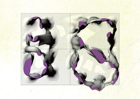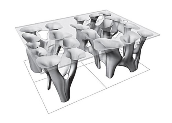 使用电脑来生成这种形态的是ESO方法,根据所给的力学条件及设计条件自动形成的造型,并在进行某种程度的调整后所得到的形态,将在被称作白色立方体的展示空间之外,以其崭新的空间形式被加以应用。