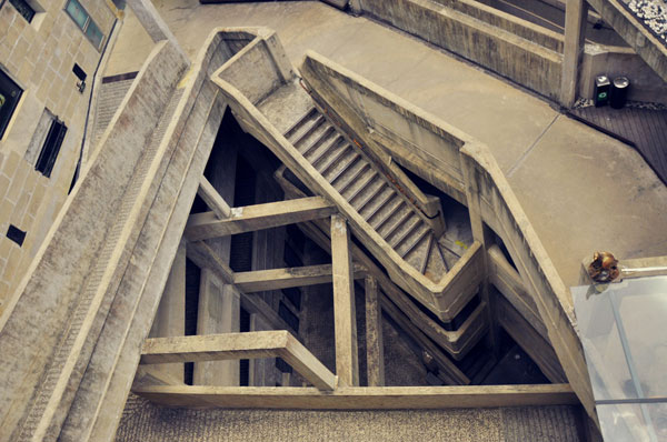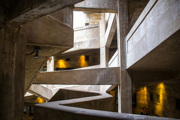 位于中心圆2层到3层之间的法式旋梯一人宽左右,优美的弧形旋转出大的角度。如此大的角度其实是为了工人逃生而设计的,中心圆是当初屠宰动物的地方,动物到此处一般会惊慌失措,为了避免因受到惊吓伤到人,特备设置了大弧度旋梯供工人逃生。