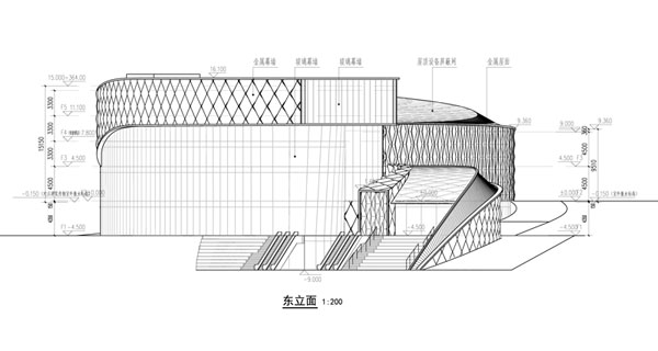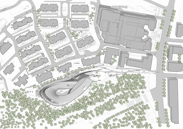 这一地标建筑以一眼定终身的魅力吸引了来访者。通过场地狭窄的入口,建筑主要特征的悬挑结构高耸于地面20米之上,成为参观者第一眼看到独特的建筑形体。在入口处,建筑回归到地面,形成建筑与景观的交点。沿着场地地形变化形成城市广场,提供休息、进餐、表演活动空间。
