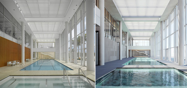 在小岛的南端有一座风格清新的建筑,其中设有室内游泳池和健身中心,通过一座郁郁葱葱的花园与会所相连。健身中心外形简洁明快,与附近的会所在 规模与造型上都形成了对比,并与会所的外向型建筑轮廓形成了一种均衡的效果,令两座建筑之间的联系更加紧密。健身中心平面格局简洁质朴,包含水疗设施、宽 阔的健身房和安静的休息室,还有一座25米长的小型健身游泳池,其上方就是屋顶的采光天窗。室内游泳池三面均为玻璃表皮包裹,从这里向外望去,能欣赏到岛 屿周围的水景。户外空间经过构思,成为一系列种植着本土花卉的花园、果园、池塘,