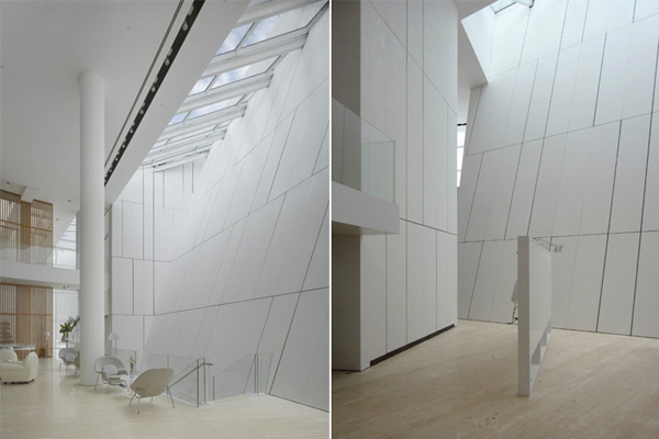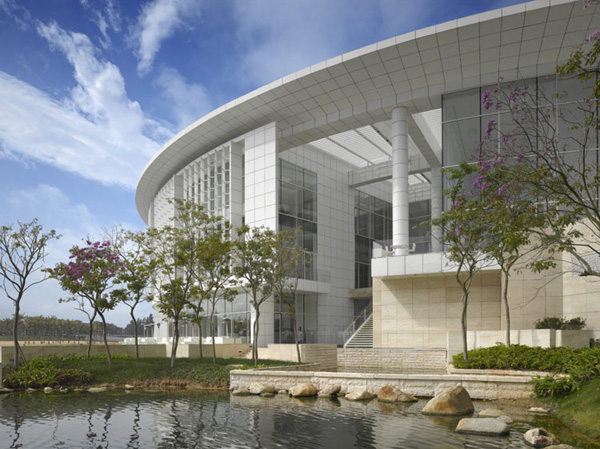 还有一个波光粼粼的水池,水流如瀑布般从主入口大厅倾泻而下,再流向建筑四周。蜿蜒的小路穿过花园,一种浓烈的中国园林设计理念扑面而来。 不同的景色、纹理和布景为人们带来了花园中的私人体验,也让人有机会体会孤独之感,并且欣赏周围水域的美景及远处的华侨城湿地娱乐零售综合建筑。