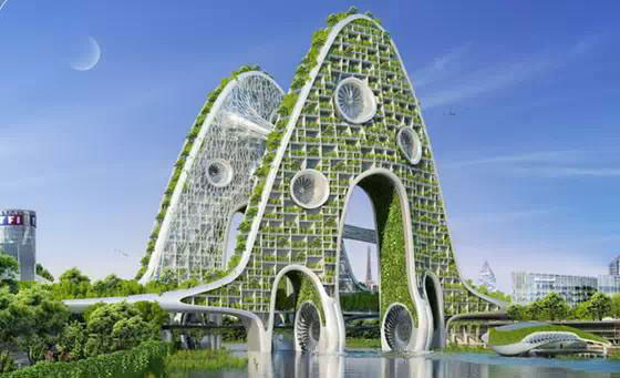 “桥塔”建筑设计,计划建造在塞纳河上,作为巴黎的河道大门。这两个桥塔建筑具有水母轮廓,特殊的多叶片风力涡轮机也可作为水力发电涡轮机,用于制造电能,同时,热力泵可以加热和冷却住宅公寓。