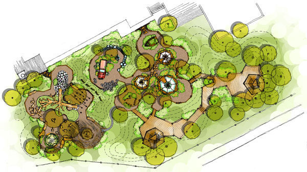 乐园是造梦的世界,树屋则是梦中的家。“融合孩子与自然”是我们的目标。在正式动工前,团队进行了庄重的"敬自然"仪式,不能因为建造树屋而锯掉任何枝叶,让自然材料和生长的树融为一体。乐园里的两个树屋,我们给它们分别取名为魔法和星云,如同它们的名字一样:魔法拥有魔力帽子一般的造型,给孩子以超能力的想象灵感空间;星云则是一个圆形木屋,被三棵大树包围,可在其圆形平台中仰望星空,找回童年里自然的回忆。