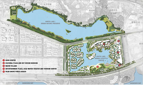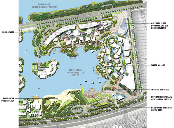 五大功能区域:购物中心、曲水街(餐饮酒吧)、度假公寓、欢乐海岸、华侨城湿地