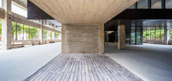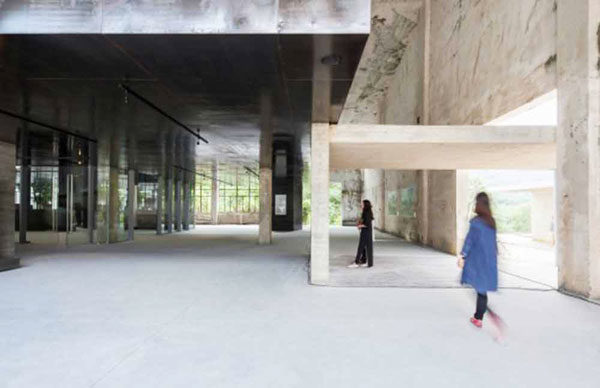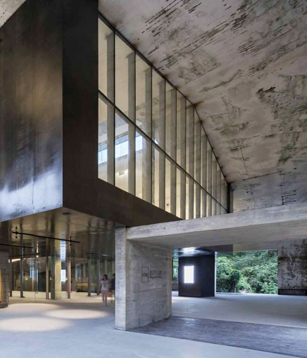 美术馆的主要入口插入了一个半开放的T形的混凝土盒子,并利用了车间南面山墙上的原有入口,并改造了工厂废弃的过滤池形成一个景观池。系列景观墙、人行与车行 坡道依造地势而起,连接了美术馆的主要入口和与城郊公路联通的略低的广场。从广场到美术馆的景观路径穿插着自然、人工、工业与后工业等多种景观,在这里, 人们能够体验并记住基地的完整的历史时间轴。
