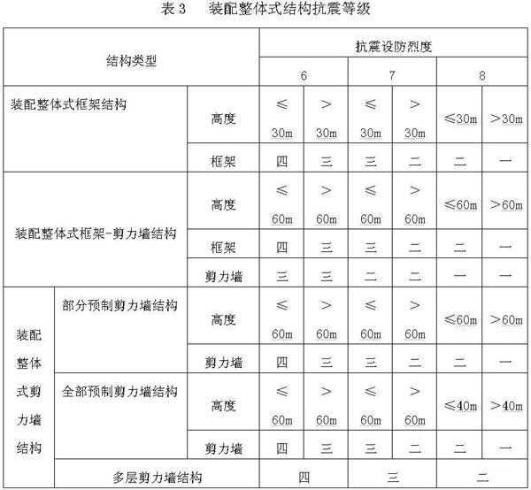 3、装配整体式结构抗震设计应根据设防烈度、结构类型和房屋高度采用不同的抗震等级,装配整体式结构抗震等级宜符合表3规定。