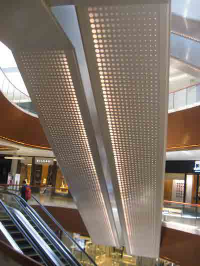 内部装修:天花板非常简洁,只是零星点点的节能灯,以及一片片椭圆形的镂空。室内用光的主色调为鹅黄色,而中庭底部连贯灯槽与自动扶梯下方如繁星般排列的小灯,则映衬着主色调进行同色系灯光点缀,使商场整体照明在白天自然舒适,夜间柔和雅致。流水造型的天窗以及自然光的引入营造出一种温暖、高雅的购物氛围。