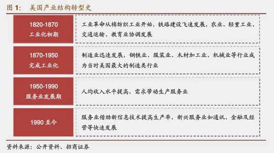 进入1970年后,随着GDP和人均收入水平的不断提高,人们的需求水平不断提高,服务业在GDP占比快这攀升。后期,借助新科技提高了服务生产率,金融保险、专业科技服务、卫生保健等行业增长迅速。
