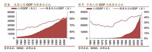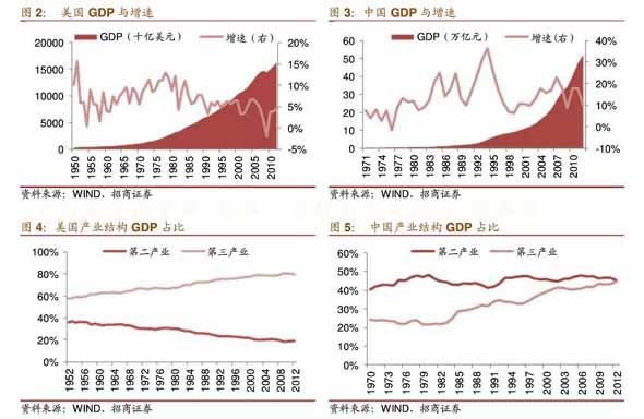 从20世纪50年代到80年代,美国服务业比重逐步上升,第三产业的GDP比重和就业人口比重从55 .0%和5 6 .6%上升到6 7 .6%和67 .8%,第二产业的G DP比重和就业人口比重略有下降,从40%和30.8%下降到30.2%和24.3%,中国第三产业自80年代后加速.发展,2012年GDP占比与第二产业基本持平,未来上升空间较大。