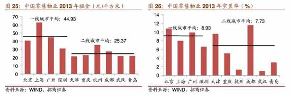 (2)推展具有层级性:目前二三线城市建筑规模明显大于一线城市。根据中国购物中心产业咨讯报告,二三线城市较一线城市表现出更高的消费率,更能带动购物中心发展.,北上广深消费率(居民个人消费和社会消费总额占当年GDP的比率)仅在0.3左右,其他二线城市平均约0.6,体现出二三线市场的发展空问。从租金和空置率水平上看,二线城市平均空置率与一线城市基本持平,租金上涨空间较大。