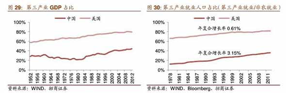 美国第三产业2012年GDP占比约79.70%,我国约44.60%,发展迅速,而我第三产业就业人士占比36.10%,年复合增长率约3.15%,目前,全国14个重点城市写字楼可租赁面积已经达到5000万平,近十年年复合增长率高达1 0.7%,而美国写字楼市场已经趋于饱和,增长率稳定在1%。